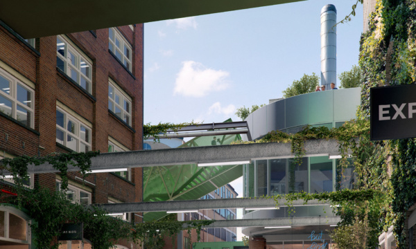 The parking deck doubles as a sound buffer between the public spaces below and the workspaces above. Roof lights draw in daylight, and the green roof buffers water and incorporates solar panels that power cars, the building and neigbourhood.