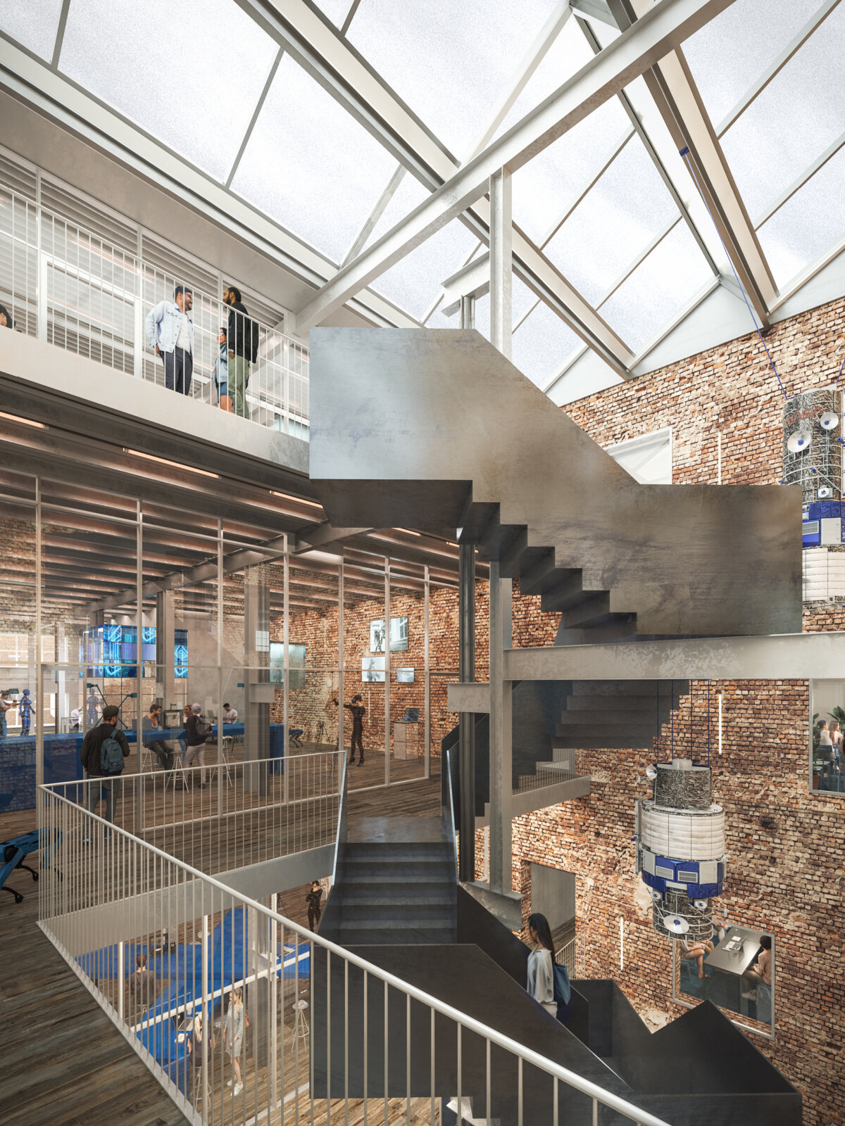 The design draws directly from the site’s industrial DNA. Rough brick and steel window frames are maintained or reintroduced, structural skeletons are revealed.