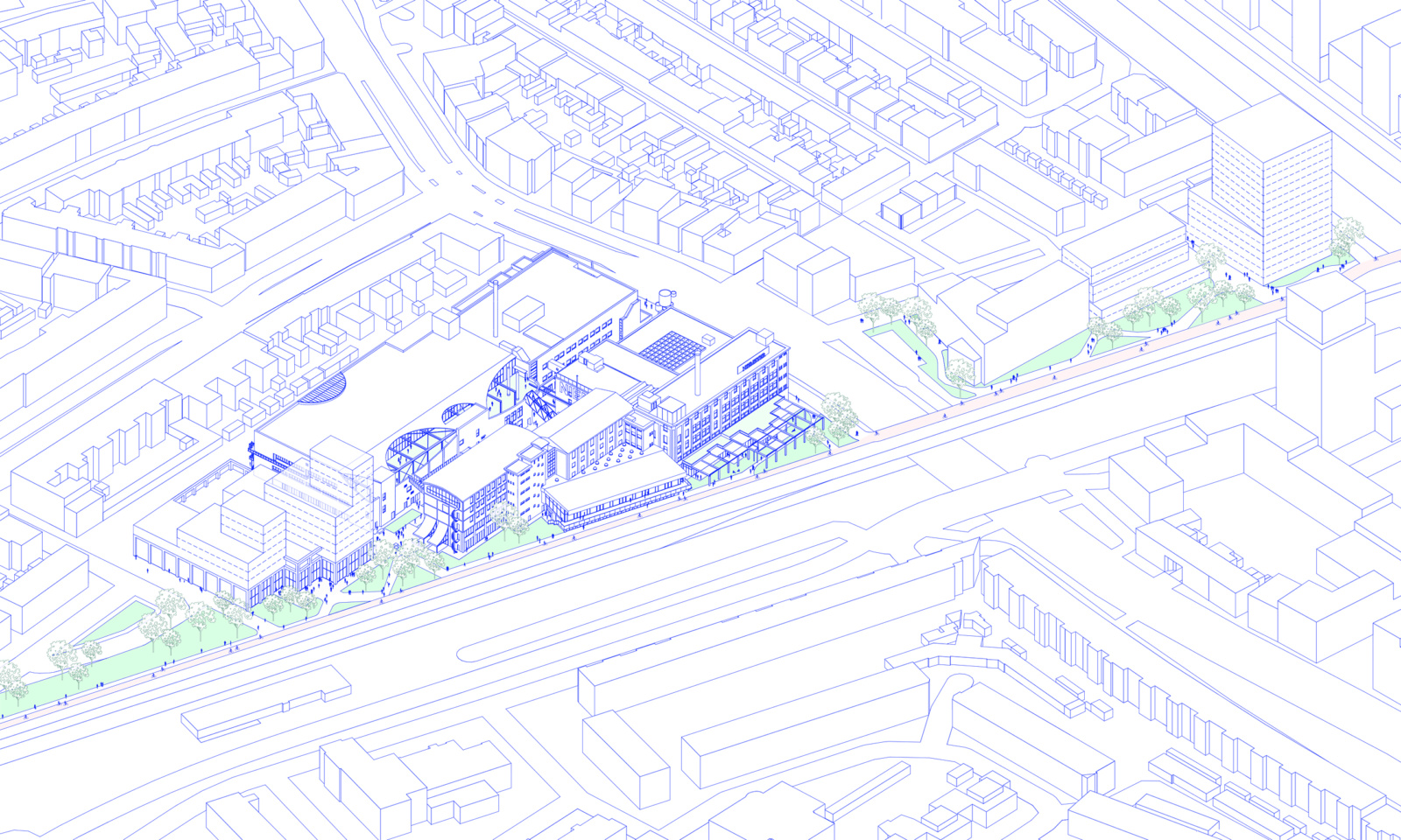 An existing basement network is repurposed for bicycle parking and infrastructure, leaving the surface open to pedestrians and public life. Cycling routes connect directly to the nearby train station and urban fabric.