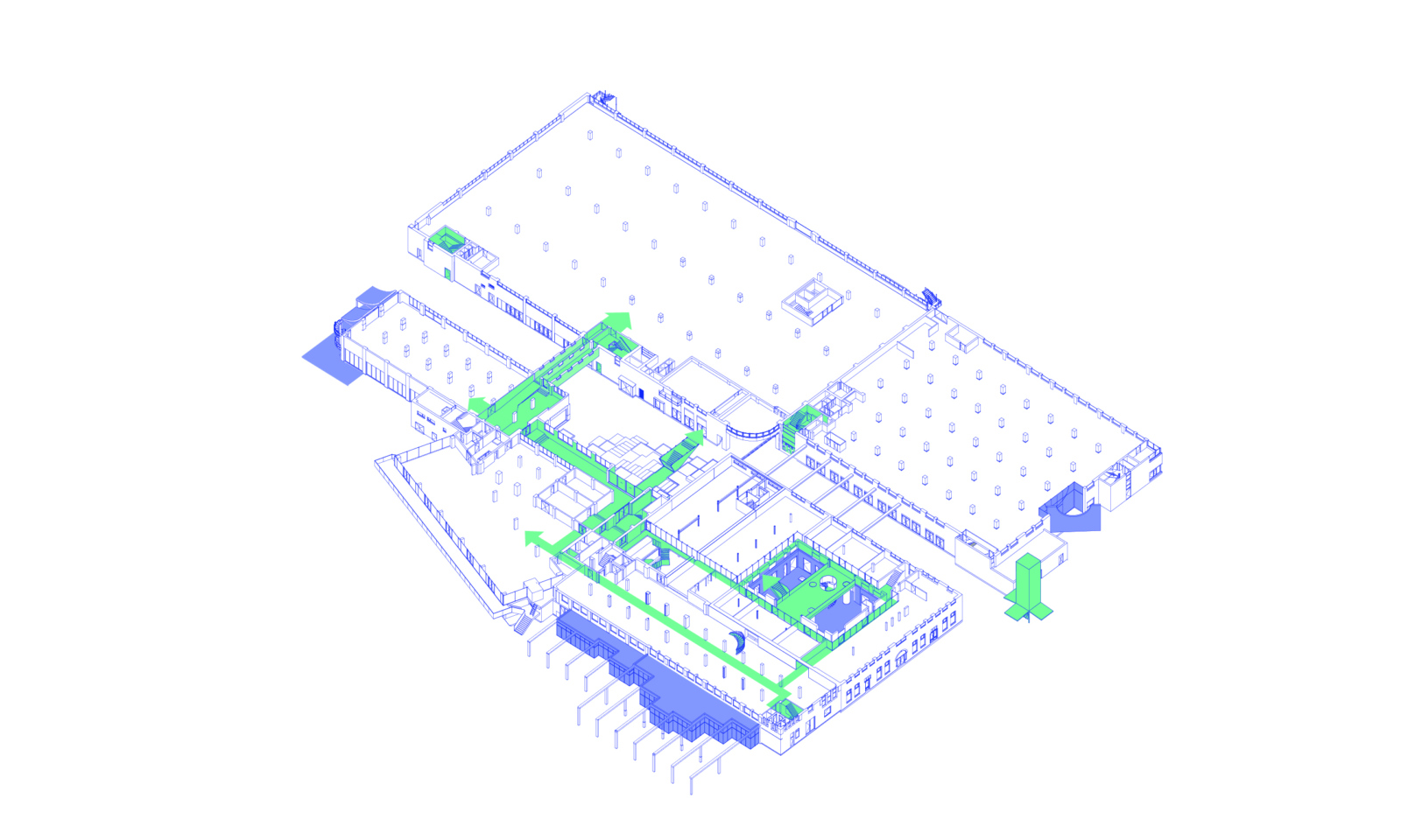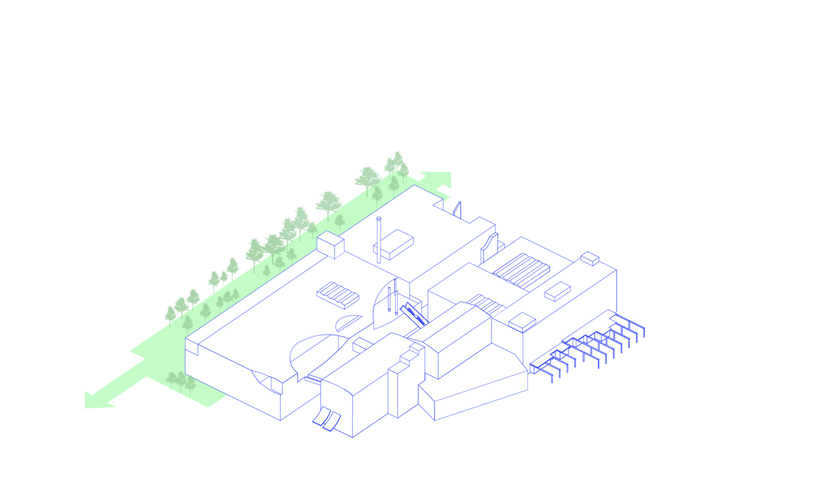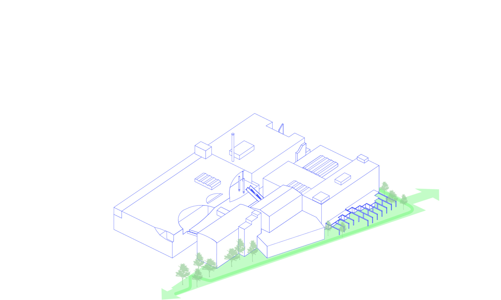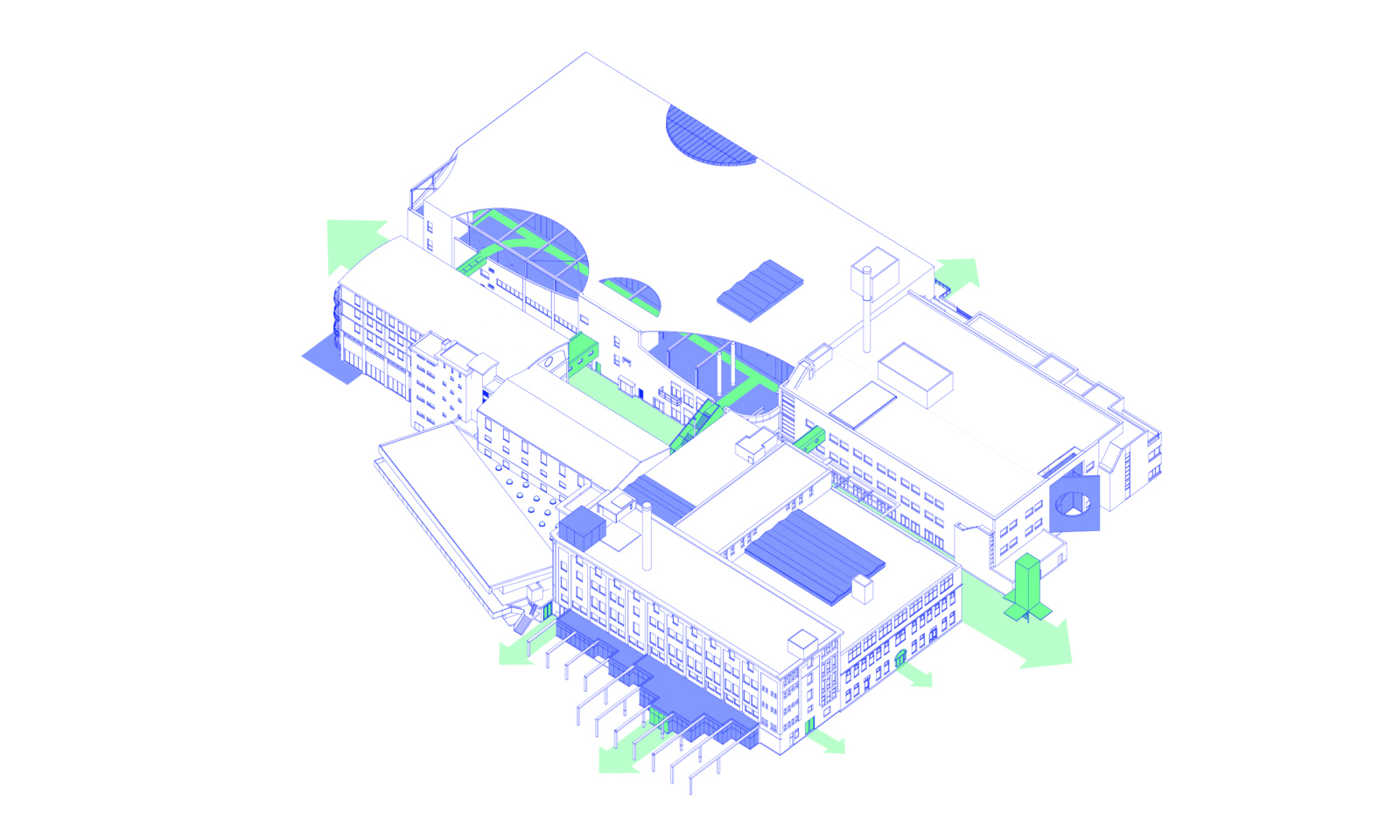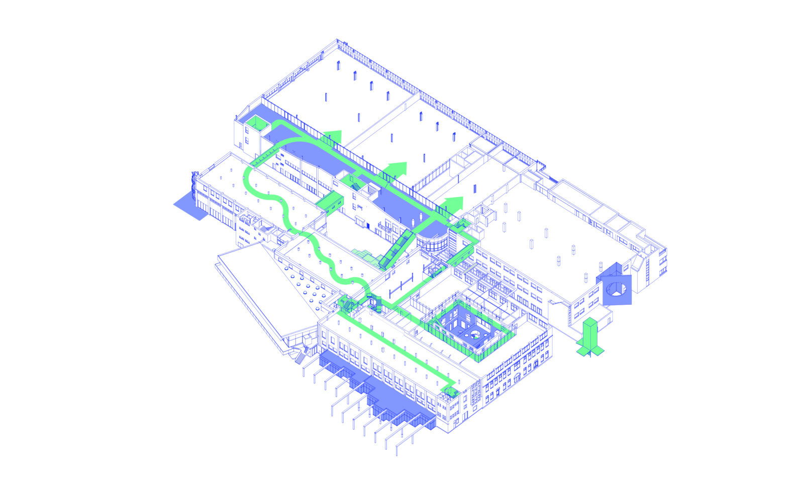 Along the buildings and functions winds the Green Route: a sequence of new stairs, bridges and walkways that traverse the blocks, linking street level to roofs and courtyards. These spatial objects turn the site into one walkable, multi-level spatial experience — where old and new uplift the other.