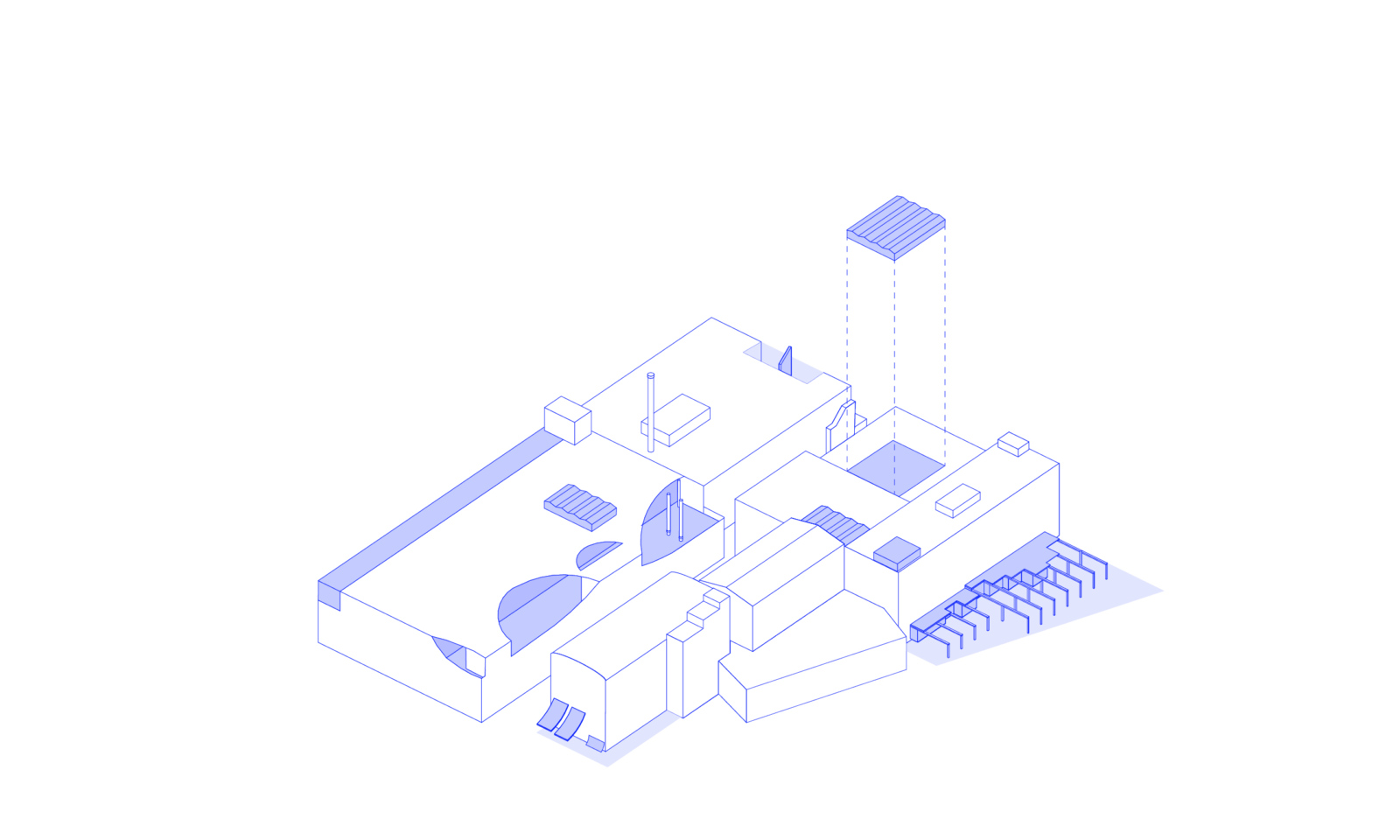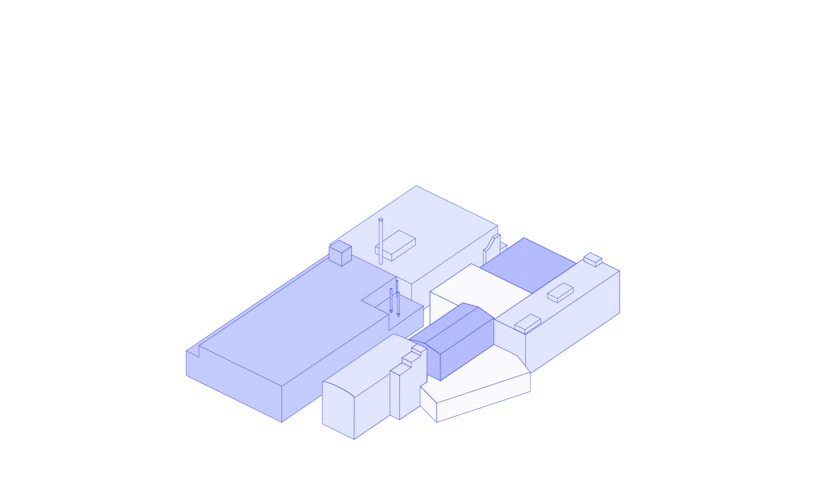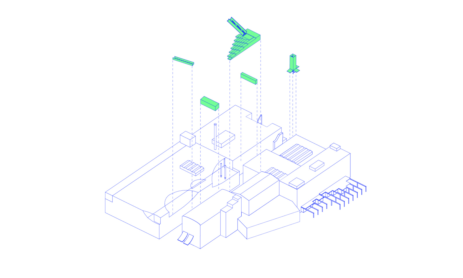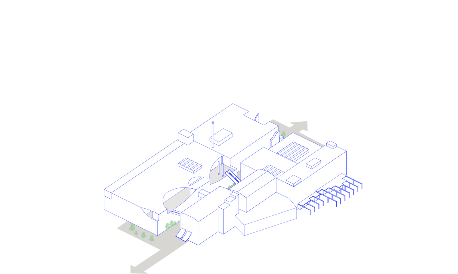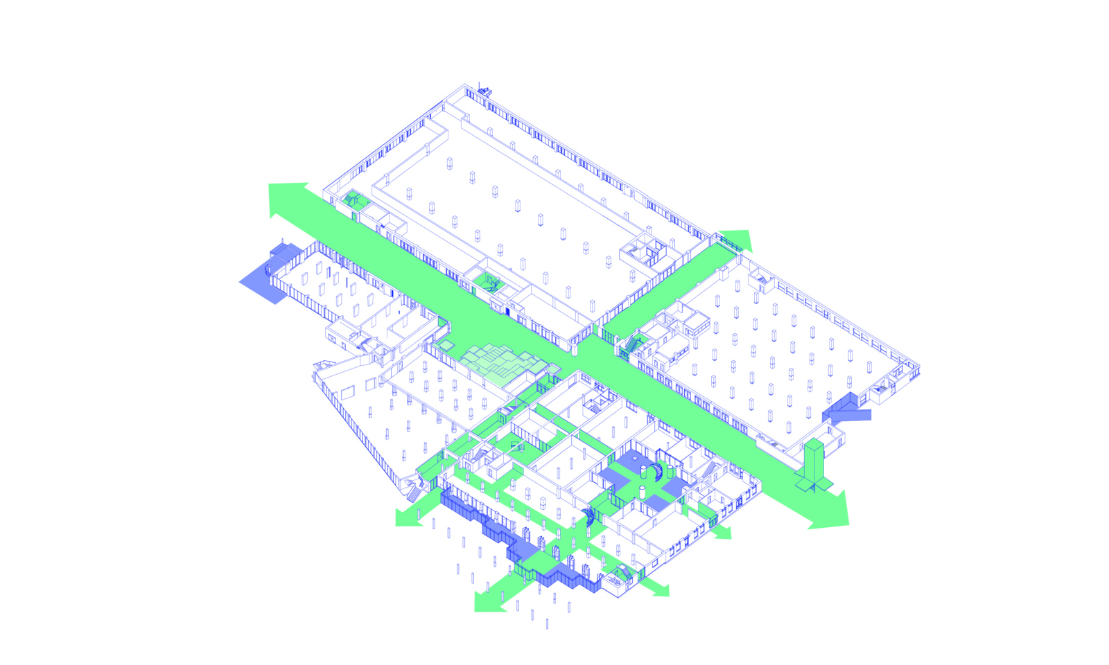 Along the buildings and functions winds the Green Route: a sequence of new stairs, bridges and walkways that traverse the blocks, linking street level to roofs and courtyards. These spatial objects turn the site into one walkable, multi-level spatial experience — where old and new uplift the other.