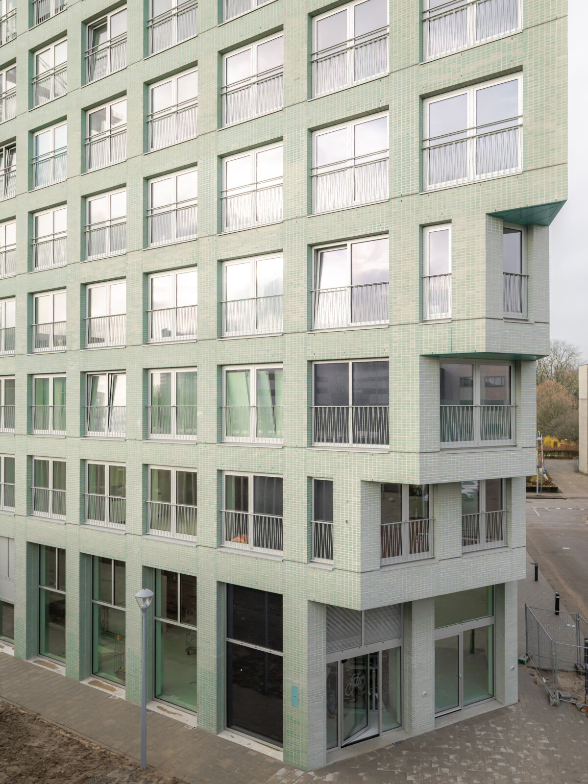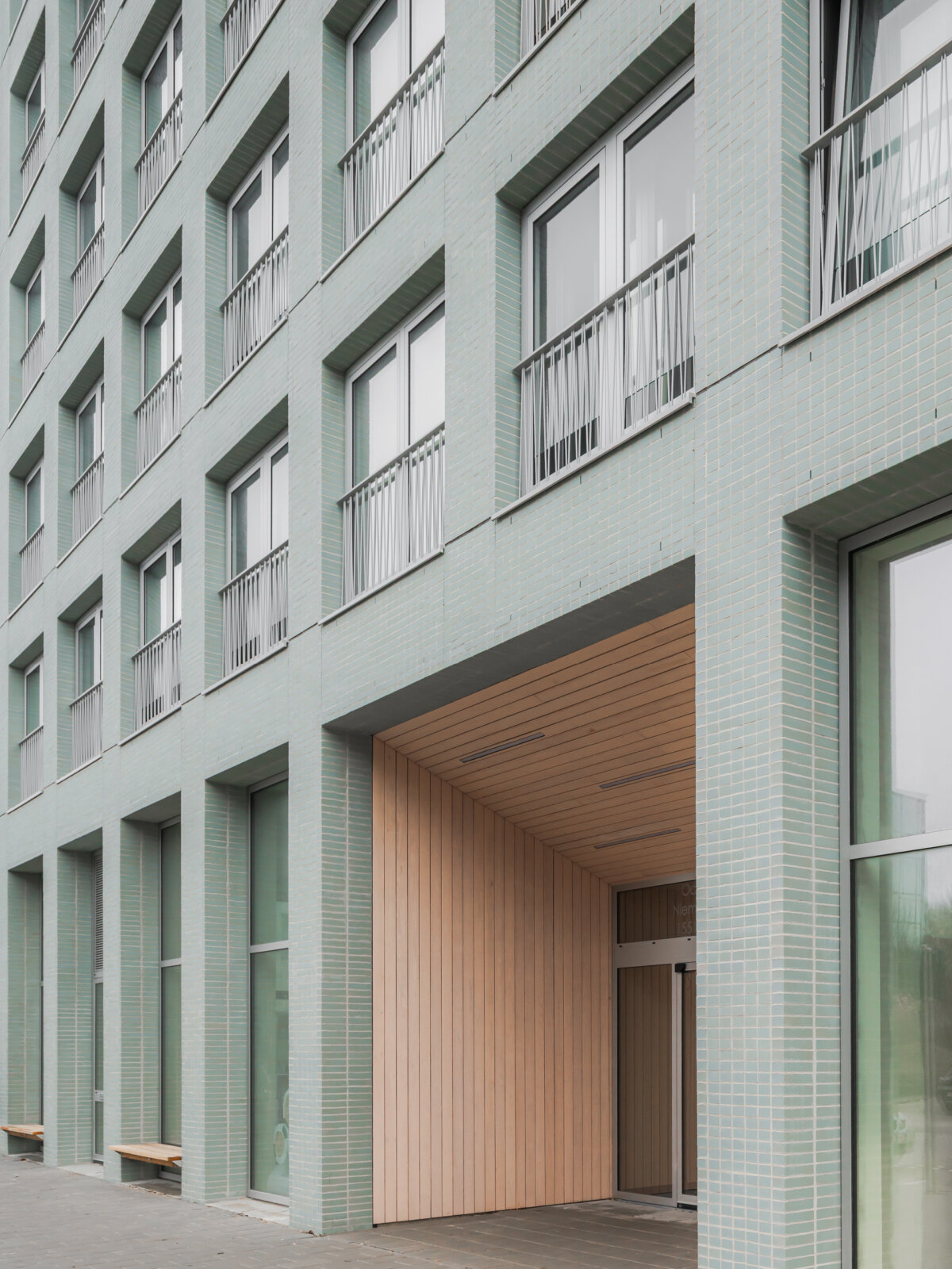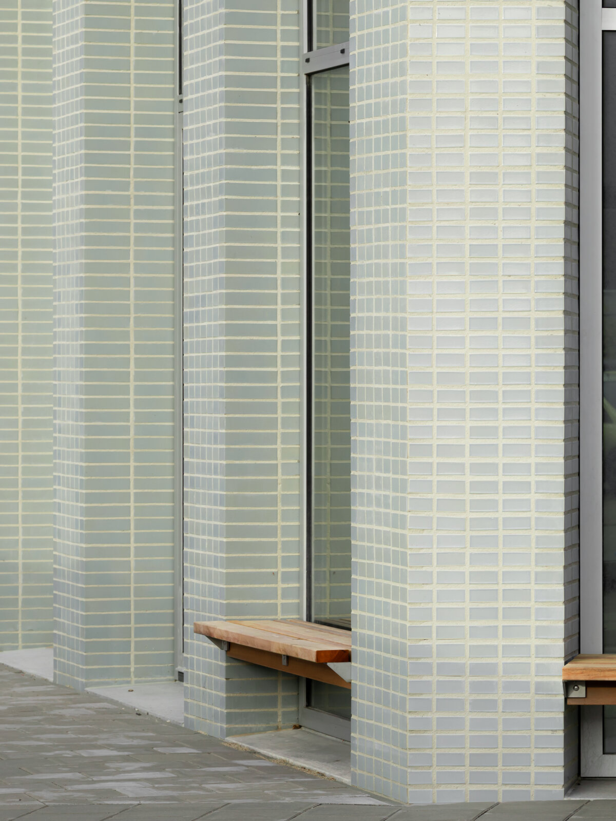We chose one single blue-green, engobed brick, which gives Octavia Hill a softened, silk-like reflection. Applying the bricks in a stack bond and equally spreading windows and piers along the facades render Octavia Hill an abstract object.