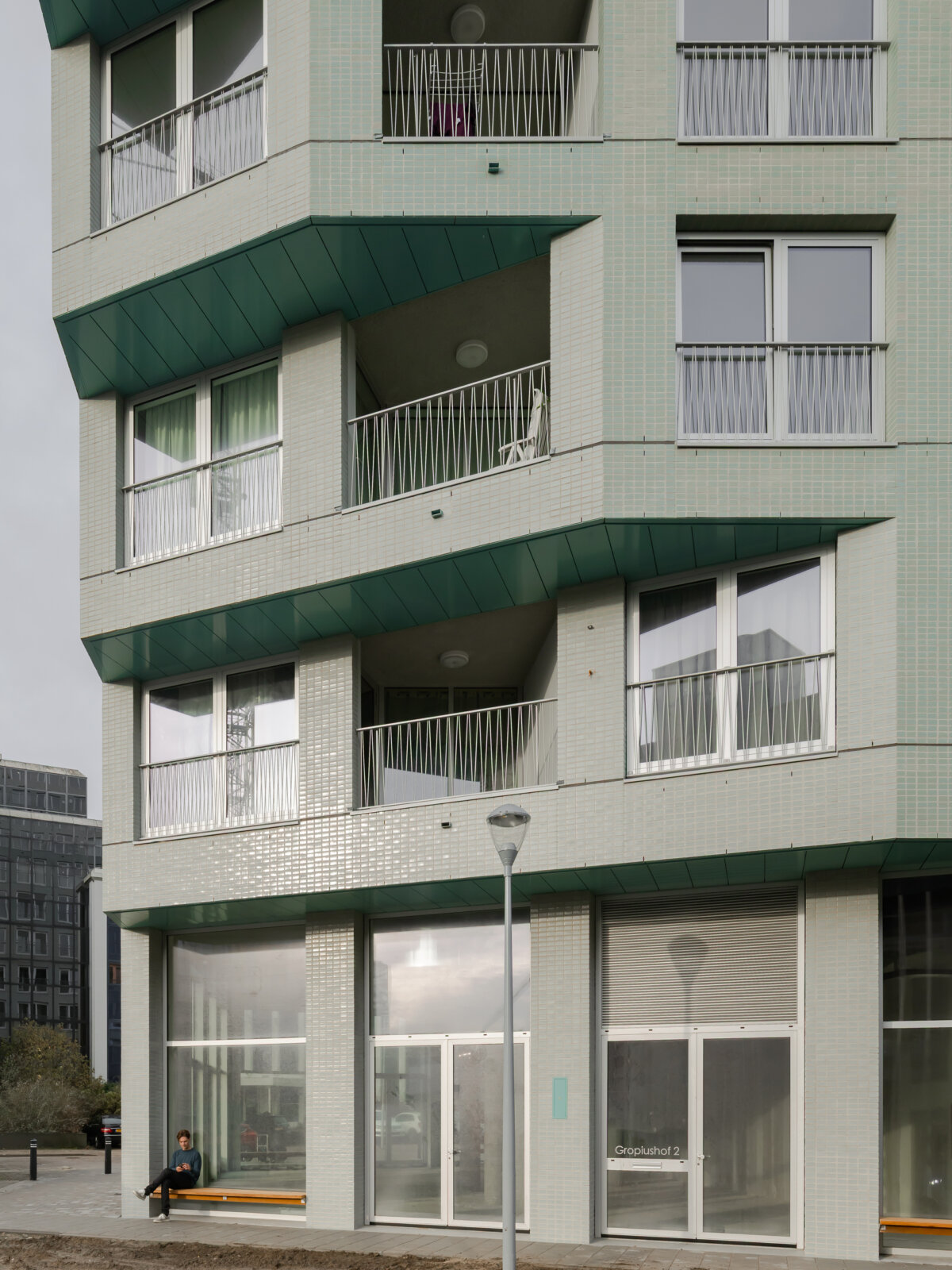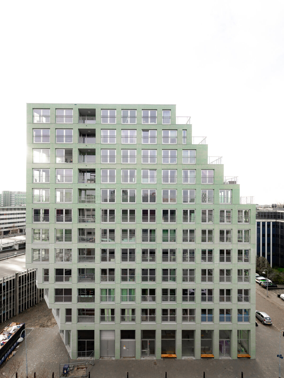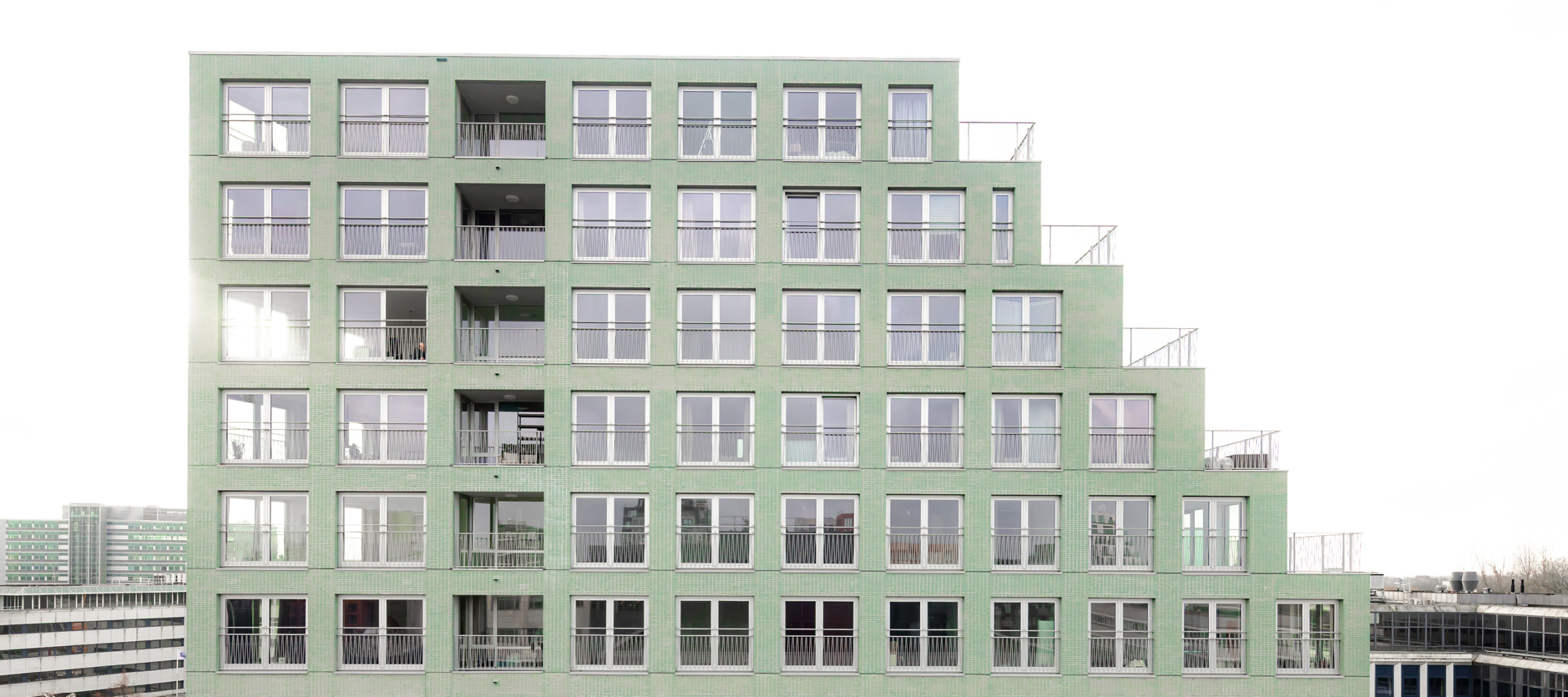 We chose one single blue-green, engobed brick, which gives Octavia Hill a softened, silk-like reflection. Applying the bricks in a stack bond and equally spreading windows and piers along the facades render Octavia Hill an abstract object.