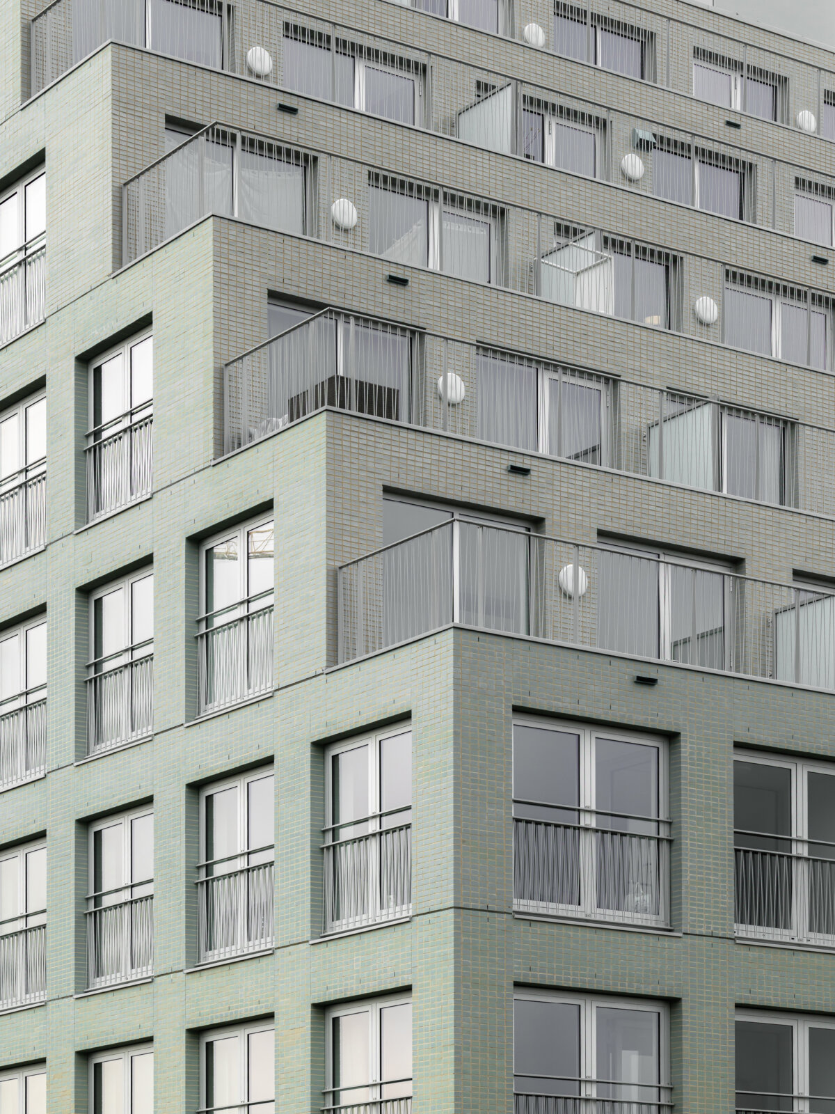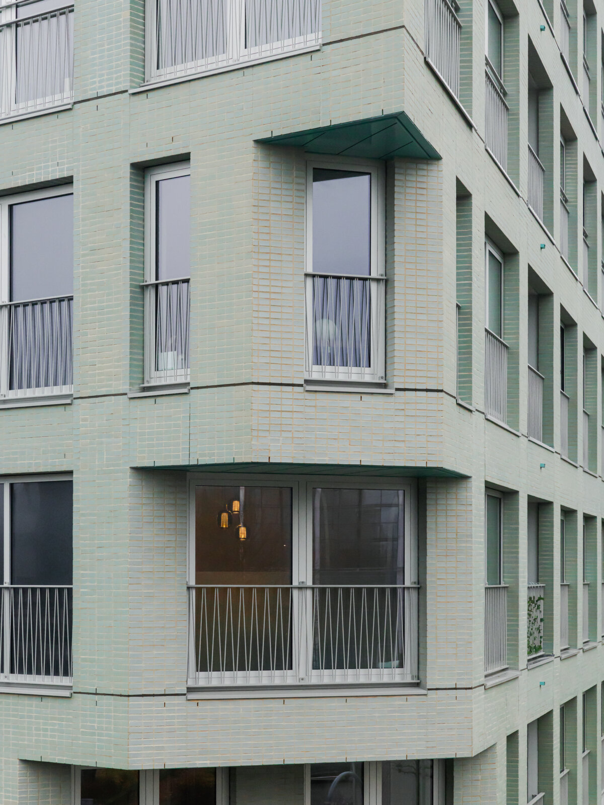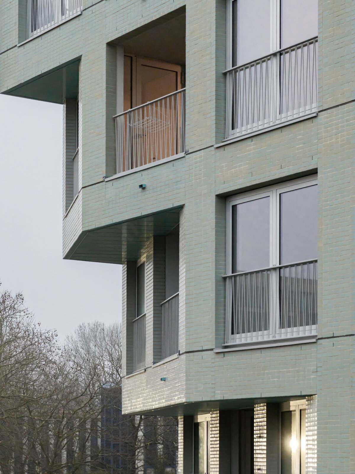 The same brick has been glazed in the bites, where it catches the light and highlights the entrances. Contrasting balustrades allow all windows to be fully opened while lending the building a warmer, more residential character.